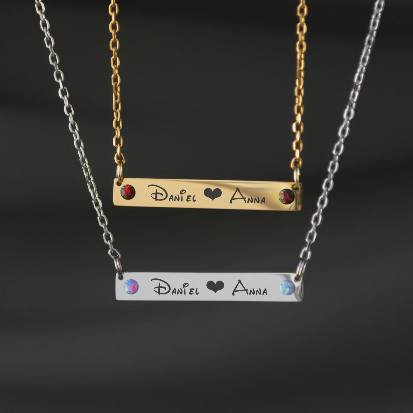 This custom engraved necklace lets you personalize every detail — from names, dates, or meaningful words to icons that reflect your story. Choose your favorite font style and optional gemstone accent to make it truly one of a kind.
