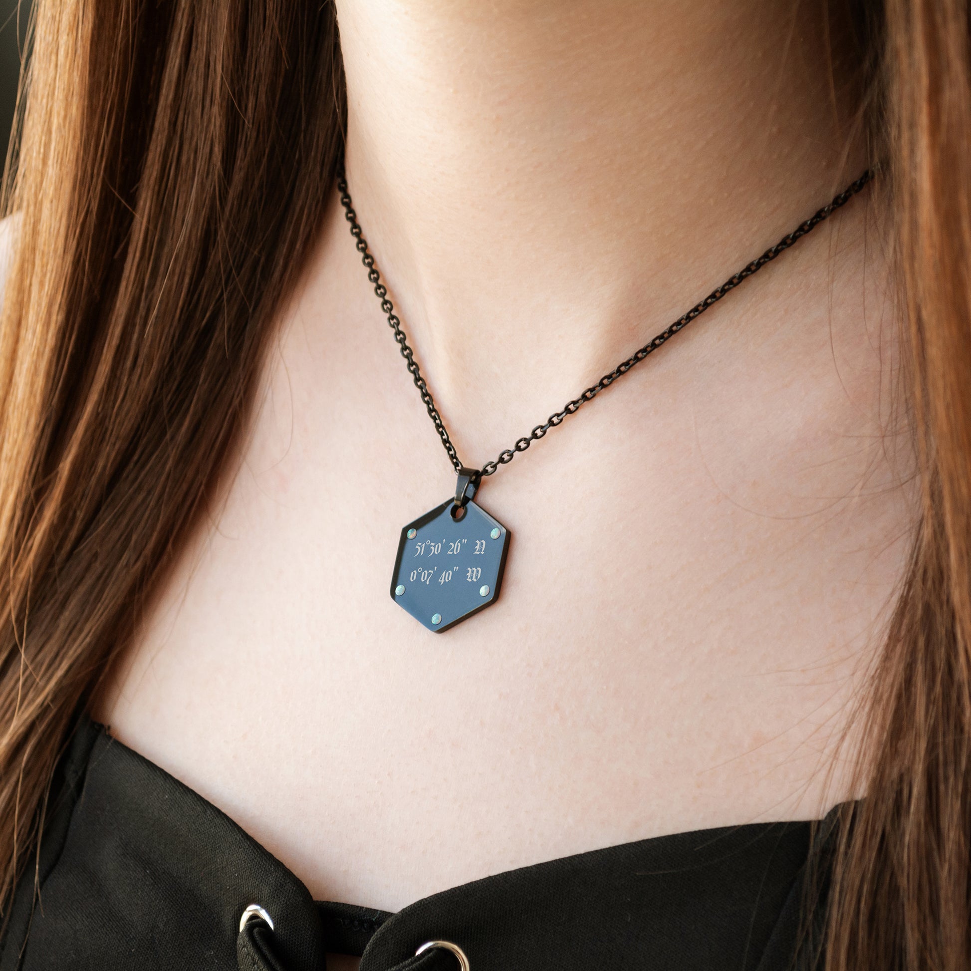 Each pendant is carefully engraved on premium stainless steel and finished in your choice of silver, gold, or black plating. The addition of beautiful gemstones — including opal, CZ, onyx or ruby — gives every piece a distinctive look. Whether you want to mark a special place, celebrate a loved one, or create a meaningful keepsake, this necklace is designed to tell your story.