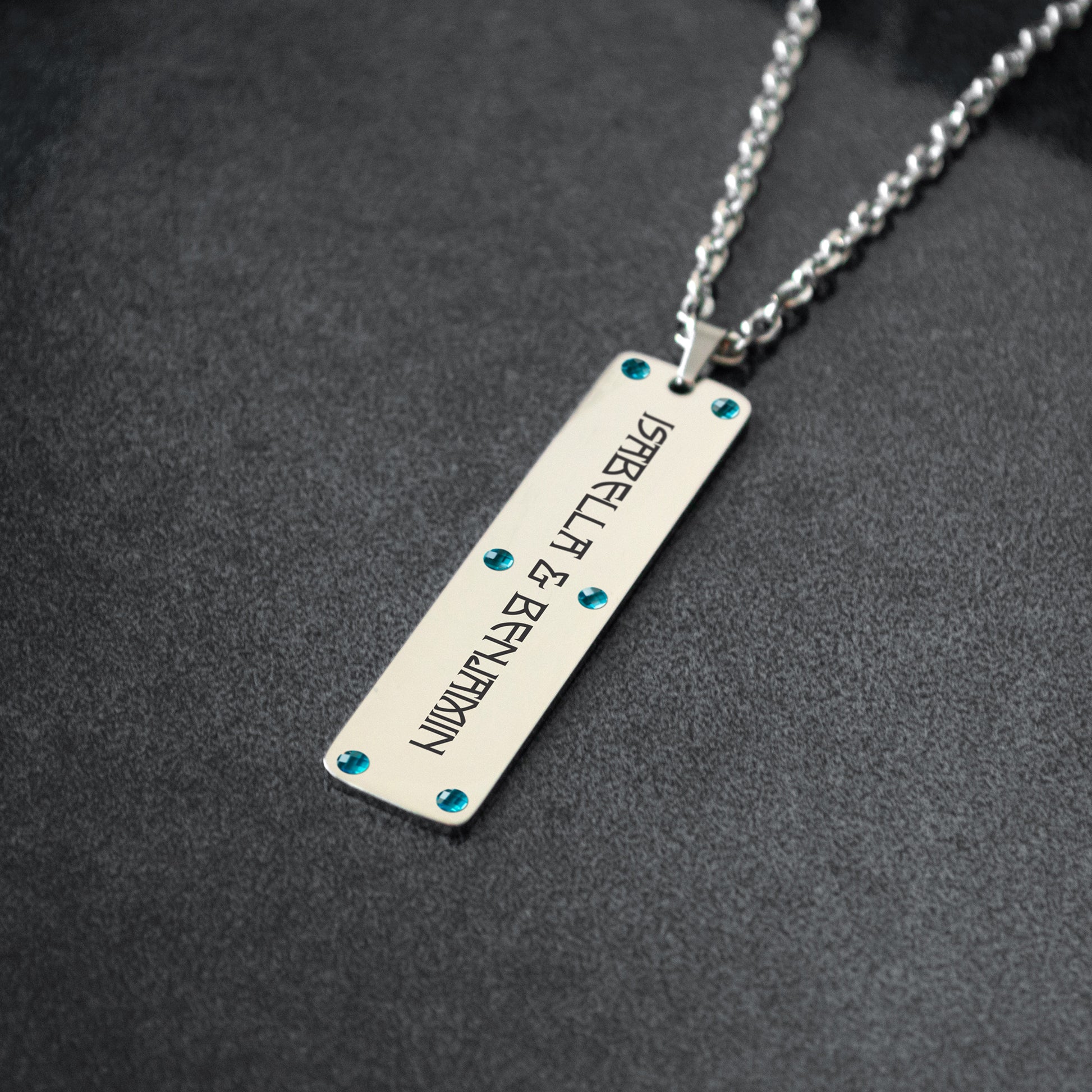 This custom engraved necklace lets you personalize every detail — from names, dates, or meaningful words to icons that reflect your story. Choose your favorite font style and optional gemstone accent to make it truly one of a kind.
