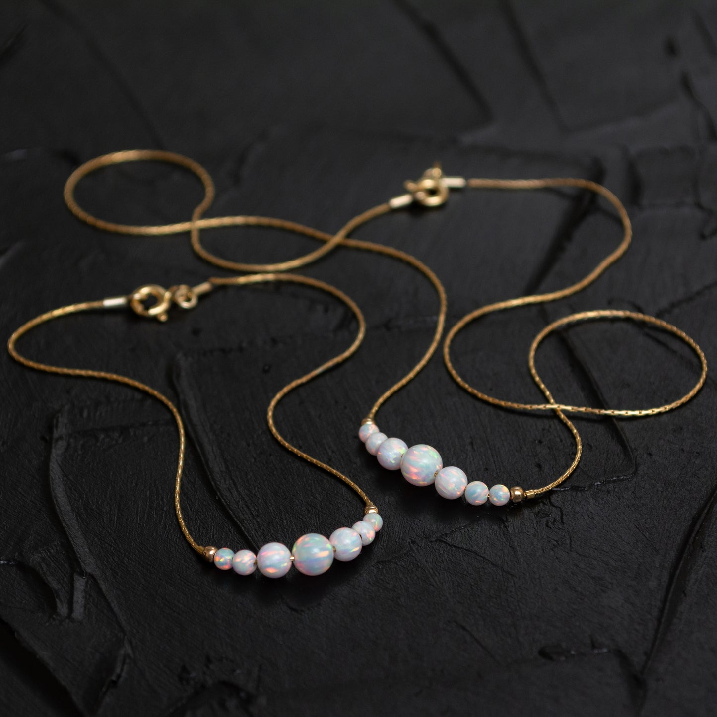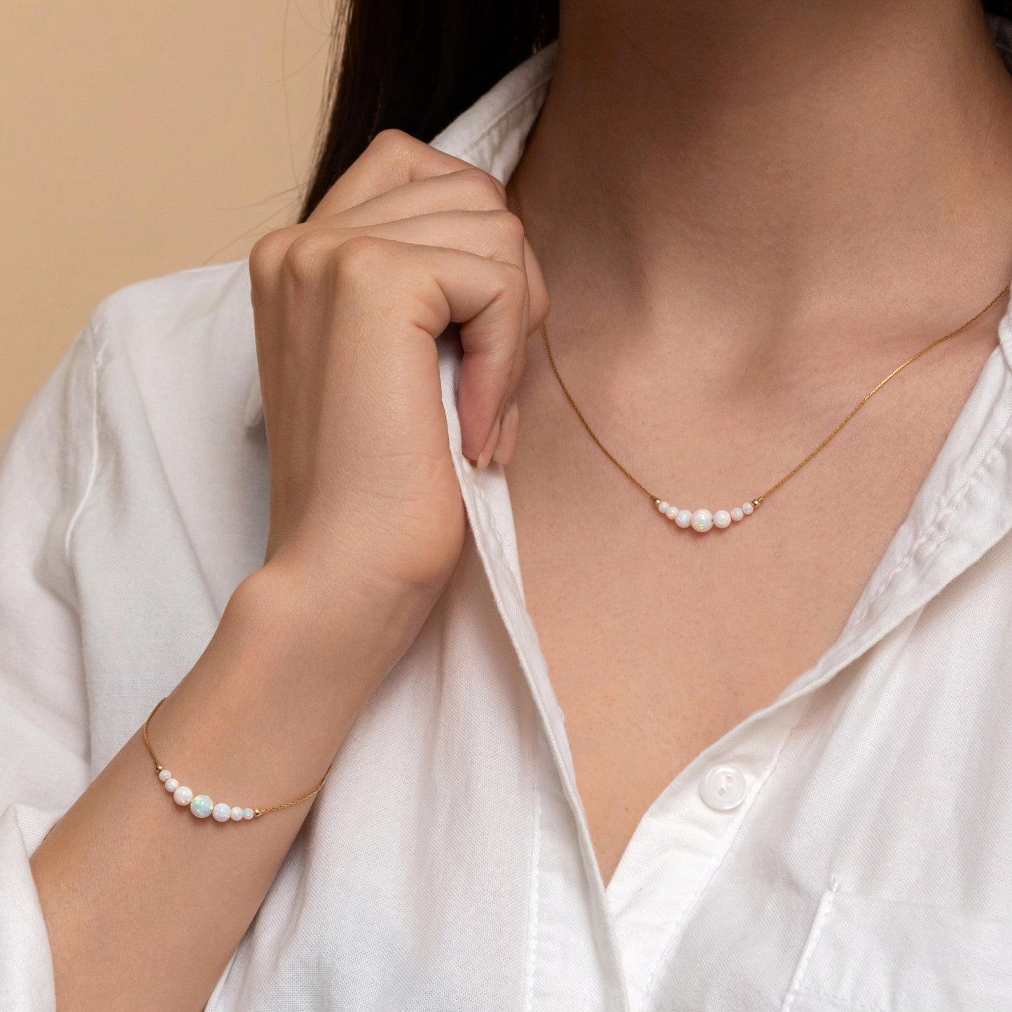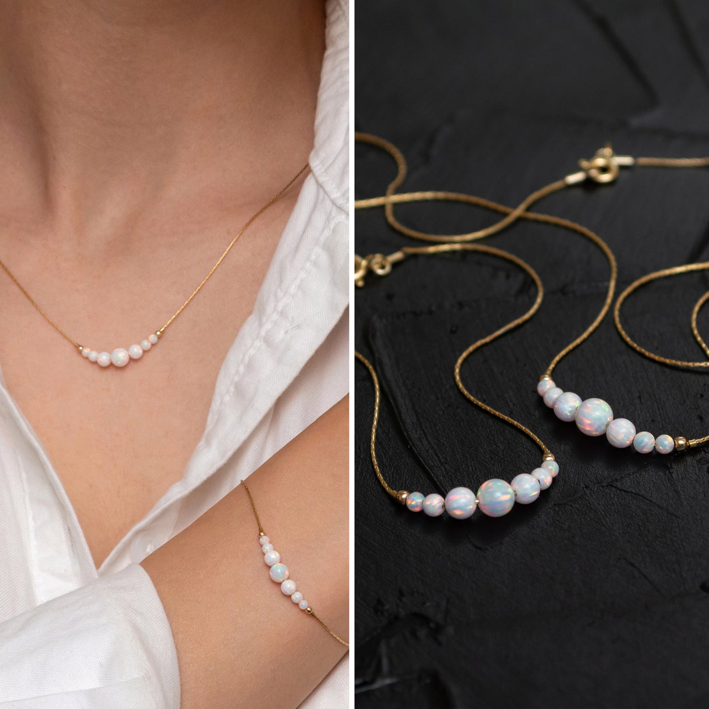 Adorn yourself with our exquisite silver or gold-filled necklace and bracelet set, featuring delicate opal beads in customizable colors, for a touch of elegance and sophistication.